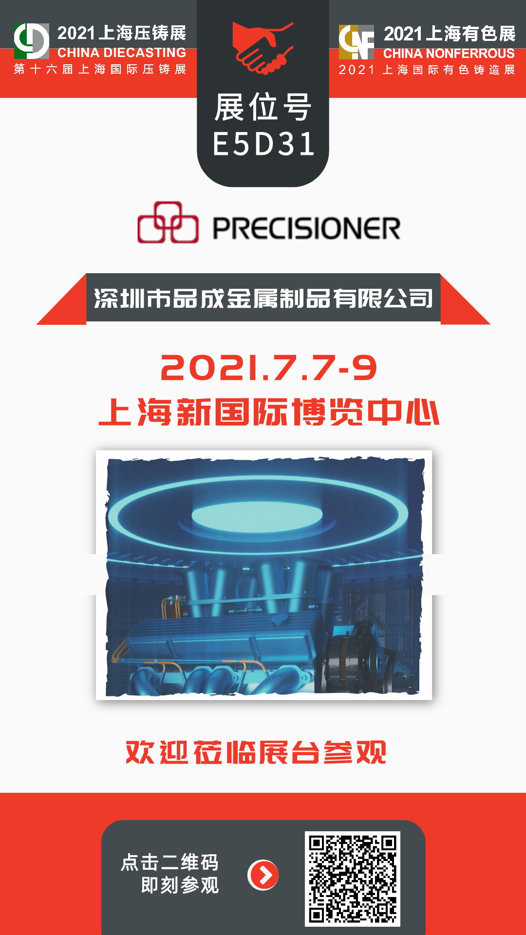 品成金屬將于2021年7月7日-9日參加第十六屆上海國際壓鑄展&2021上海國際有色鑄造展,展位號為E5D31。該展會將全方位展示壓鑄及有色鑄造全產業鏈解決方案,促進企業相互學習、交流碰撞和集智發展,引領行業未來發展新趨勢。現誠邀各位行業人士蒞臨我們的展位參觀,品成全體員工恭候您的到來,一起攜手挑戰,共創未來!